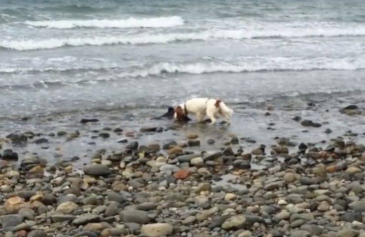 Il quattro zampe è rimasto al fianco del piccolo mammifero in difficoltà con l’obiettivo di segnalare la sua presenza all’uomo. Il padroncino, dopo essersi avvicinato al segugio, ha filmante notato la presenza del piccolo delfino rimasto incastonato tra i sassi. L’uomo – come mostra il video – lo ha issato, con molta cura, per poi infine liberarlo in acqua.