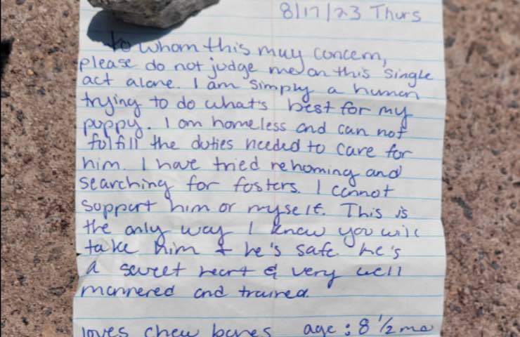 L’uomo che ha abbandonato Milo chiede – nella lettera scritta per coloro che lo avrebbero ritrovato – di non essere giudicato per questo singolo atto. “Sono soltanto un uomo semplice che sta cercando di fare il meglio per il mio cucciolo“, spiega l’uomo. “Sono senza una casa e non ho la possibilità di prendermi cura di lui“. L’uomo avrebbe cercato a lungo qualcuno che potesse sostituirlo nel suo compito, ma senza alcun risultato. “Non posso sostentare né lui né me stesso“, ha aggiunto il senzatetto fornendo una descrizione del Pit Bull quanto il più possibile dettaglia.