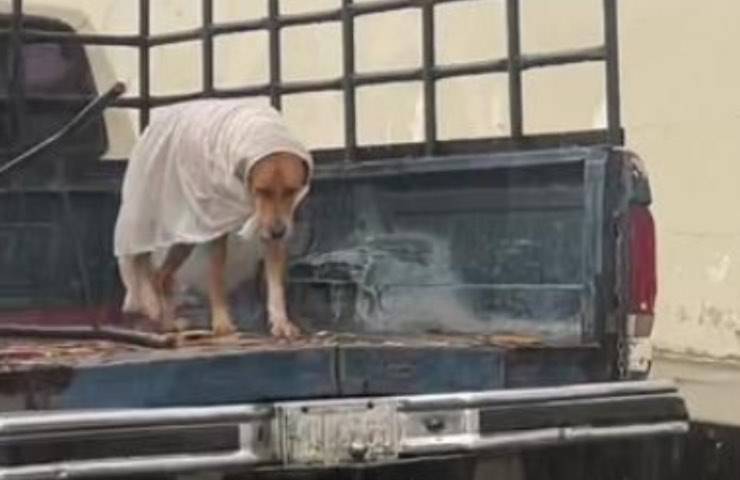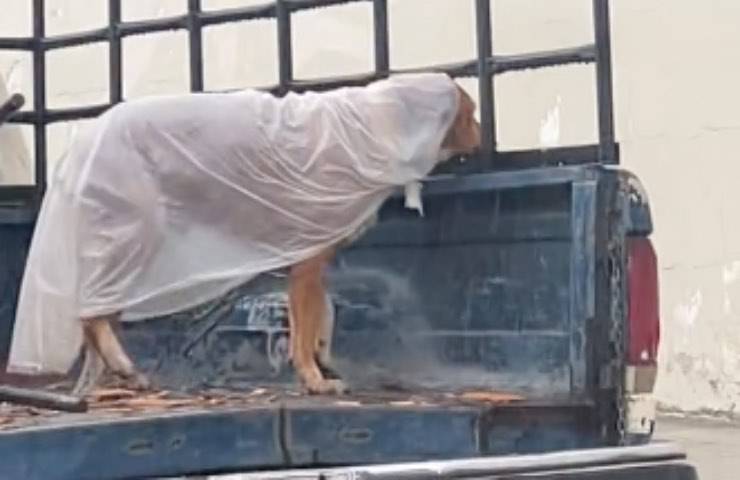 Cane indossa in transito un originale impermeabile per ripararsi dalla pioggia: è un amore