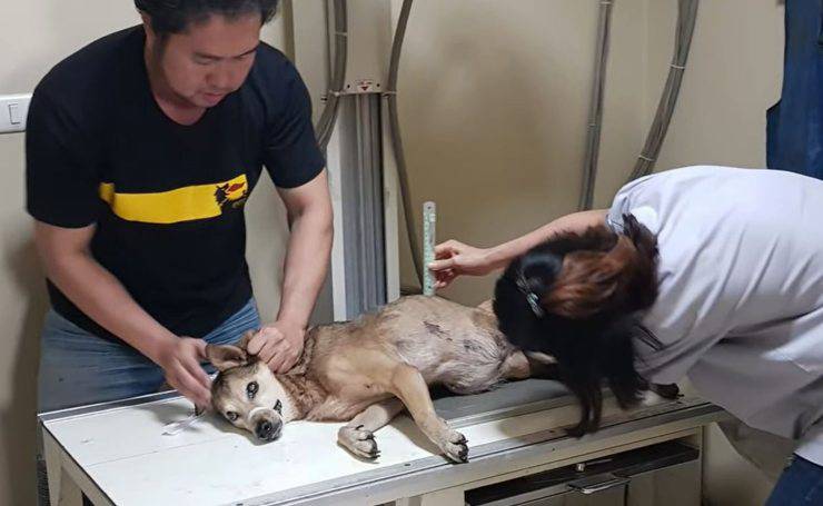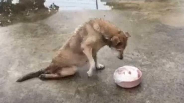 La donna porge del cibo al cane: poi fa curare le sue zampe posteriori e gli dona una seconda e nuova vita