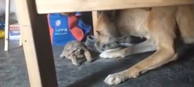 In primo piano ci sono i due animali che probabilmente si concedevano un momento di riposo. La tartaruga però non era proprio rilassatissima e decide che dare fastidio all’amico cane fosse la cosa più divertente da fare.