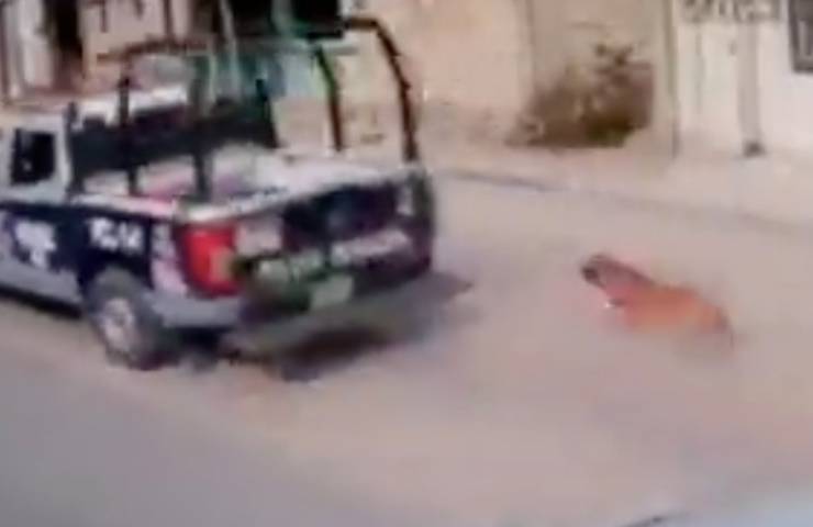 Le immagini rivelano infatti le dinamiche dell’accaduto: un’auto della polizia prosegue la sua corsa ignorando le difficoltà del cane, precedentemente legato ad essa, nel tentare di sostenere la velocità del veicolo in movimento. Il pelosetto infatti, non reggendo la sproporzione di forze in azione, è stato poi letteralmente trascinato dalla vettura riportato ferite su tutto il corpo.