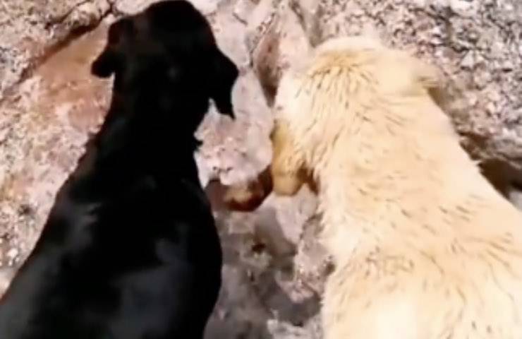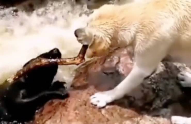 La missione di salvataggio del cucciolo è stata immortalata in un virale filmato apparso su TikTok nei giorni scorsi. I due cani, entrambi due esemplari di Labrador Retriever, si sono rivelati un vivente esempio di solidarietà tra simili. Per riuscire a trattenere il secondo cane, che rischiava di affondare nell’acqua del fiume, il primo – Golden dal pelo bianco – si è agilmente servito di un bastone trovato lungo la riva, e con il quale ha potuto fungere da ancora di salvezza per quello che sarebbe divenuto – da lì a poco – il suo migliore amico.