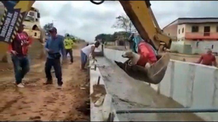 L’incredibile evento è accaduto nella provincia di El Oro in Ecuador, dove gli operai stavano lavorando come di consueto quando hanno notato un animale che cadeva in acqua. Senza pensarci due volte, hanno escogitato un piano d’azione per salvare l’animale, che nel mentre stava lottando per non affogare. Uno dei lavoratori è salito sul braccio di un escavatore ed è sceso nel canale ed è riuscito ad afferrare il cane che veniva trascinato dalla corrente.