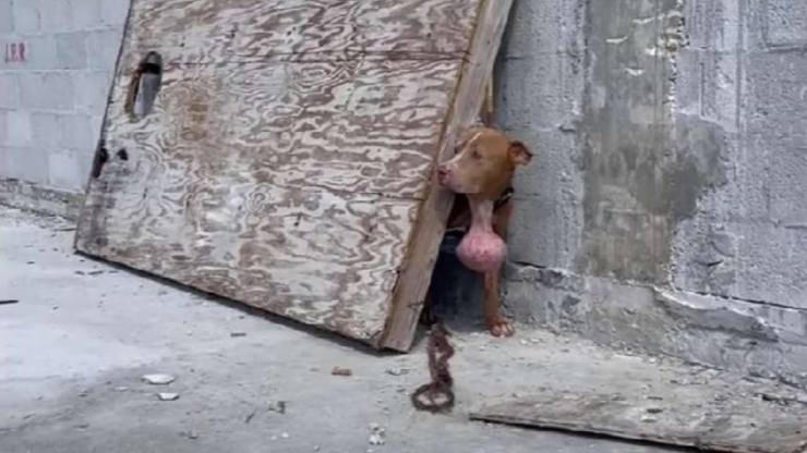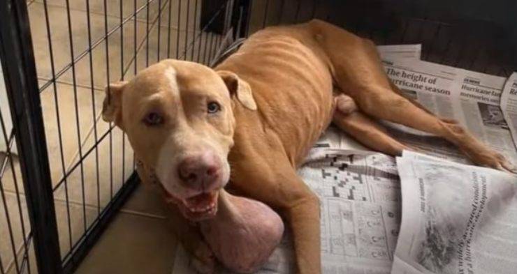 Il cane ha un enorme tumore proprio in prossimità del collo ed è talmente gigante che mette a repentaglio la sua vita.
