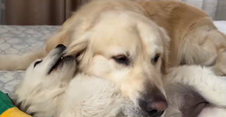 I protagonisti indiscussi di questa vicenda sono due esemplari di Golden retriever che hanno sorpreso gli utenti del web con le loro irresistibili trovate. Tra tutte, quella che ha riscosso maggiore successo ha riguardato la scelta del cane adulto di usare il cucciolo di cane come cuscino. Un’idea insolita ma per nulla azzardata se consideriamo il fatto che il pelosetto è molto morbido e coccolone. Il tenero momento è stato catturato dal padrone che ha immortalato l’attimo in un tenerissimo video pubblicato su You Tube. La scena comincia con il cucciolo disteso sul pavimento intento a divertirsi con un peluche che usa come giocattolo. Il suo fratellone resta sui di lui, senza battere ciglio. La sua espressione è rilassata, serena. Il cucciolo si dimena ma a lui non interessa affatto. Resta comodo nella sua posizione e non si muove da lì.