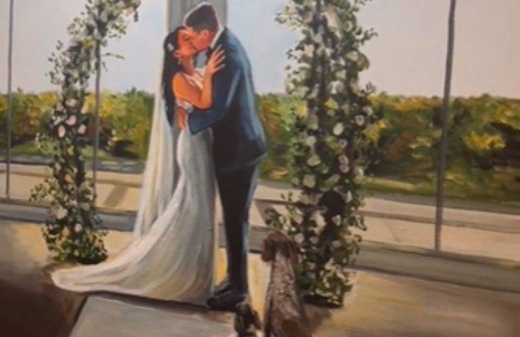 Un dipinto per includere i loro cani e ricordare il cucciolo da poco scomparso: il regalo pensato dalla sposa commuove tutti (VIDEO)