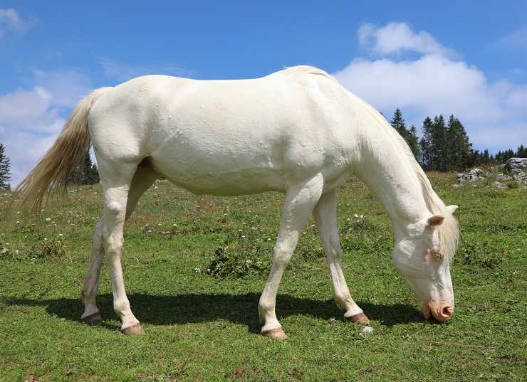 Ma da cosa dipende il manto bianco di un equino? Solitamente la depigmentazione del pelo è dovuta alla presenza di un gene, quello grigio, che ‘decolora’ il pelo nei cavalli man mano che avanza l’età (infatti un cavallo più giovane avrà il pelo grigio e, con l’avanzare dell’età, diventerà bianco). Quindi il bianco del pelo è dovuto a: