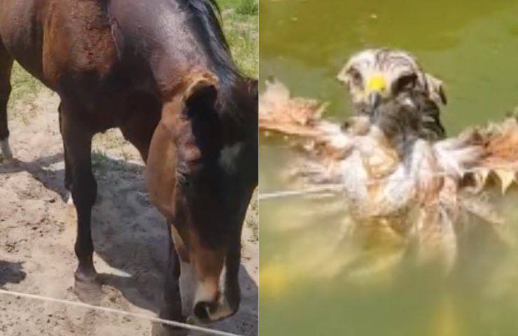 Un gufo rischia di annegare, un cavallo interviene: ma l’umano che è con lui gli salva la vita