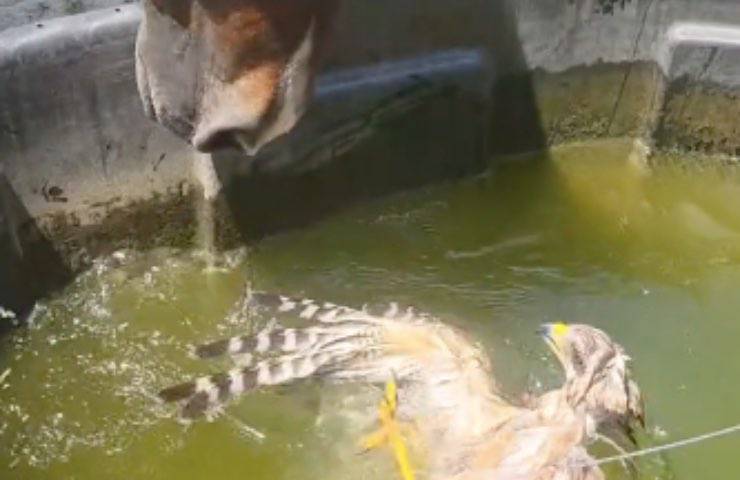 L’intervento del cavallo, che ha vestito – per l’occasione – i panni di uno scrupoloso aiutante, ha di certo suscitato una notevole empatia nell’animo degli utenti. L’animale, avvicinatosi curiosamente al volatile in difficoltà, avrebbe cercato di scoprire cosa stesse accadendo nella vasca d’acqua posta di fronte a lui.