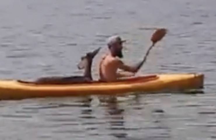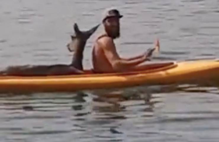 L’uomo – probabilmente appassionato di canottaggio – si trovava a percorrere il corso d’acqua, quando – all’improvviso – ha notato un animale che a stento riusciva a tenersi a galla. Avvicinatosi all’esemplare in pericolo con la sua canoa, l’uomo ha sollevato la cerva dall’acqua – che, forse risucchiata da alcuni mulinelli, si dibatteva per restare in vita – e l’ha accolta nel suo simpatico mezzo di trasporto divenuto a due posti all’occorrenza.