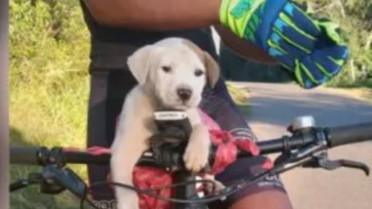 Il cane ora è salvo: il ciclista vede in tempo la scena e interviene assieme alla moglie in pochi secondi