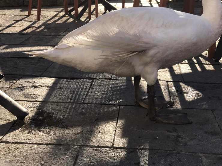 Un cigno si aggira tra i tavolini del bar per cercare aiuto per la sua ala ferita