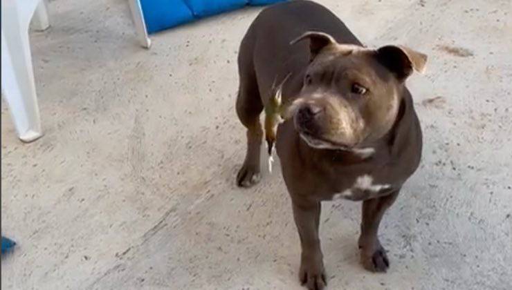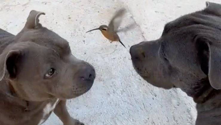 Colibrì visita la coppia di Pit bull e li coglie di sorpresa