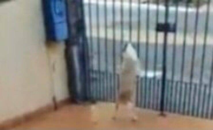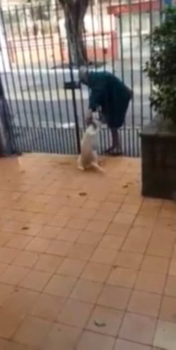 La cagnolina non resiste e non sa trattenere l’euforia. Quando sa che sta per passare il suo amico inizia a scodinzolare e saltare impaziente sul cancello, sapendo che pochi passi dividono l’uomo da lei.