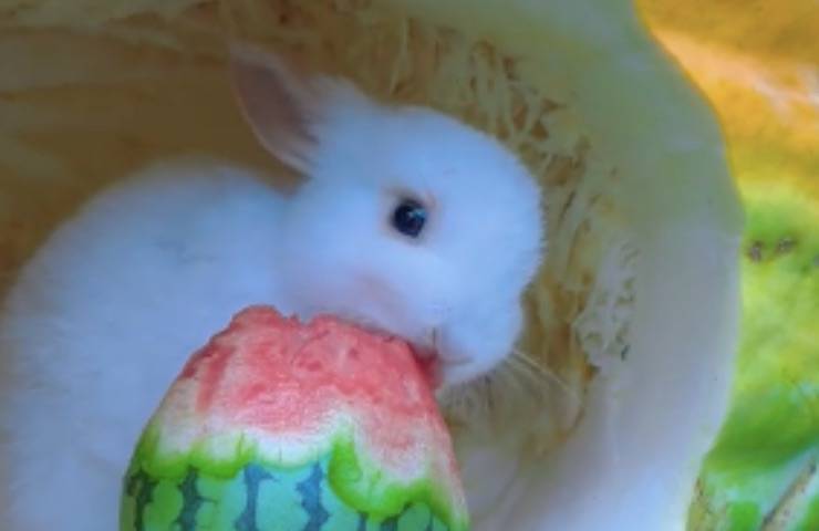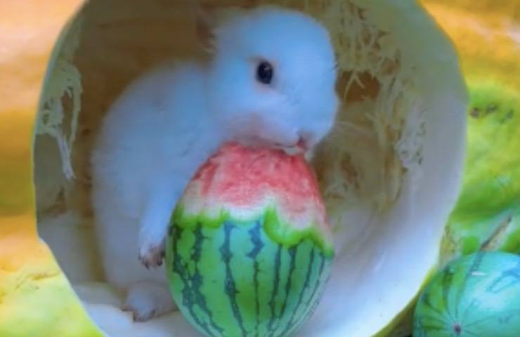 La scorpacciata di questo tenerissimo coniglietto bianco diventa virale: quanto amore per un’anguria di fine estate