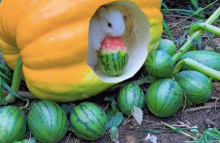 Il dolce animaletto, che da tempo immemore rappresenta il simbolo della Pasqua per eccellenza, è in questo caso immortalato nel modo più “adorabile” e fuori da ogni stereotipo già trattato. Uno dei dettagli che sembrerebbe aver favorito la popolarità del coniglietto sarebbe il suono emesso dal suo gustare la piccola anguria. La zucca, inoltre, sembra servire – in questo caso – da perfetta cassa di risonanza.