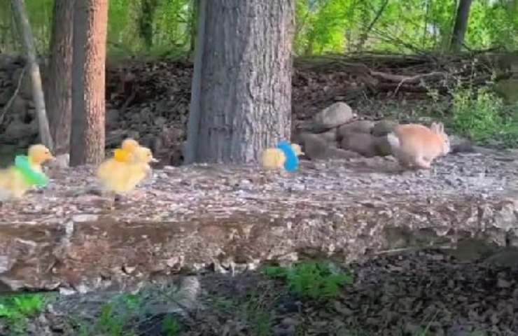 Guida gli anatroccoli verso lo stagno: il coniglietto è dolcissimo nel video virale