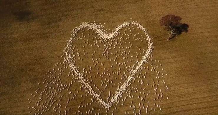 Il contadino ha distribuito il cibo per le pecore sul pascolo, creando la forma. Dopo di che ha liberato il gregge dal recinto che, avventandosi sul mangime, si è disposto in modo tale da creare il cuore.