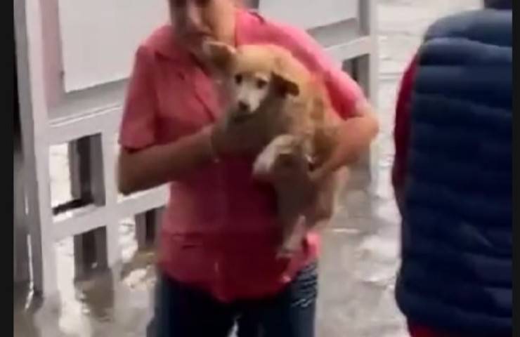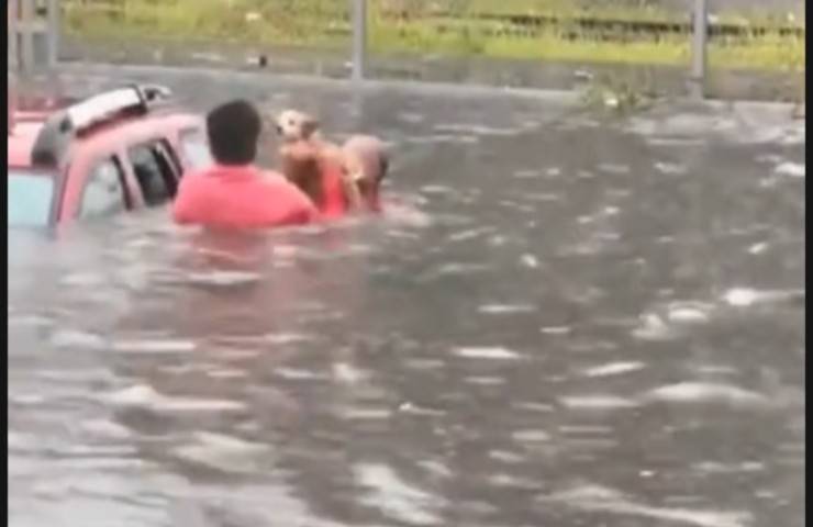 La coppia in compagni del loro cagnolino si è quindi trovata incastrata tra la vita e la morte in una strada diventata come un torrente in piena senza la possibilità di riuscire ad uscire indenni da soli da quella situazione.