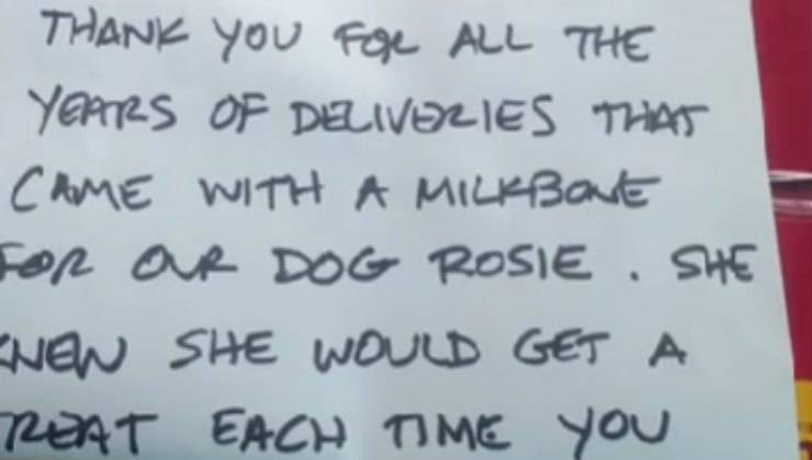 Il corriere passa spesso per quella casa, un giorno trova il biglietto di addio del cane a cui regalava sempre un biscotto.