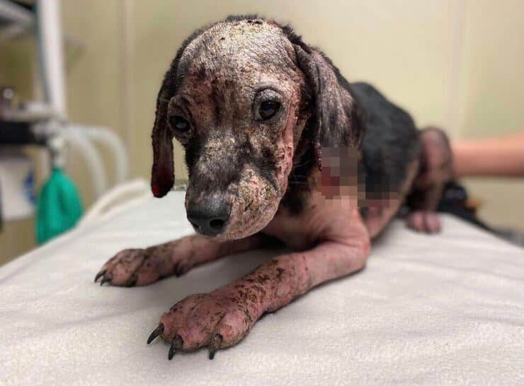 Appena aperta la scatola, la situazione palesata ha fatto commuovere i membri dello staff. Il piccolo cucciolo, tremolante e spaventato, era in condizioni fisiche terribili. Subito è saltato agli occhi la pelle infiammata, gonfia e senza la presenza della naturale pelliccia che sarebbe dovuta essere presente.