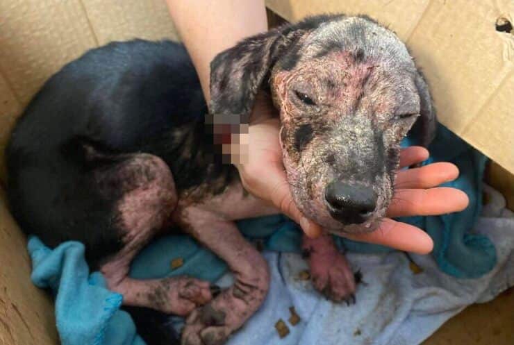 Le condizioni del cucciolo abbandonato sono gravissime. Lasciato in una scatola chiusa con del nastro, ora lotta per la sua vita