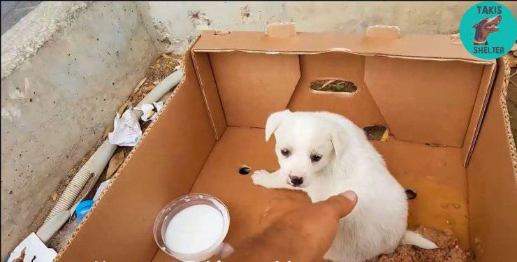 Il cucciolo se ne stava lì, fermo in quello scatolone all’interno del quale era stato sistemato un contenitore con del latte, davanti al supermarket.