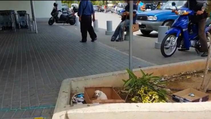 Un cucciolo di cane è stato abbandonato in uno scatolone davanti ad un supermercato: una scena a cui la gente si è abituata