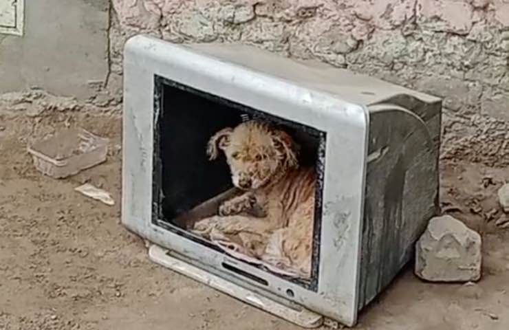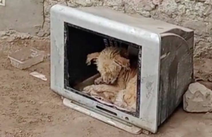 Un cucciolo di cane cerca riparo all’interno di una TV abbandonata dove vive dopo il suo abbandono: la clip è estremamente toccante.