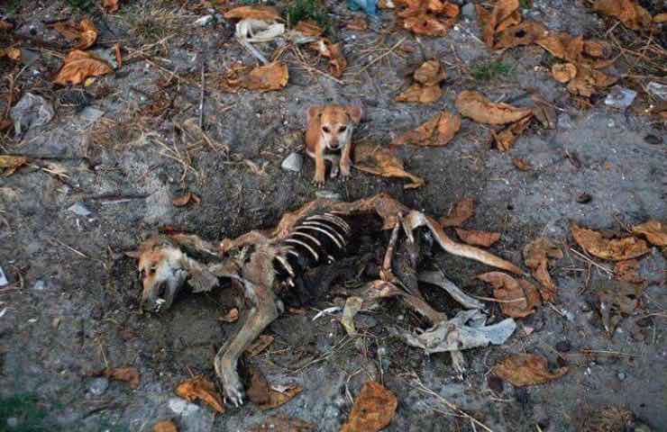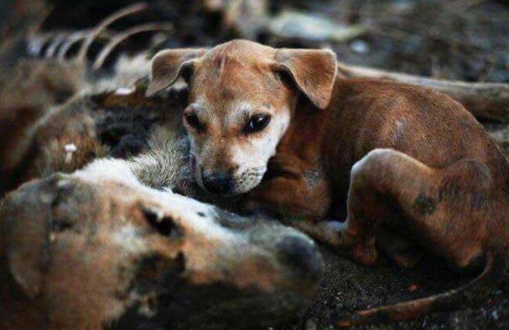 Un cucciolo di cane non vuole lasciare il corpo della mamma morta: le strazianti immagini