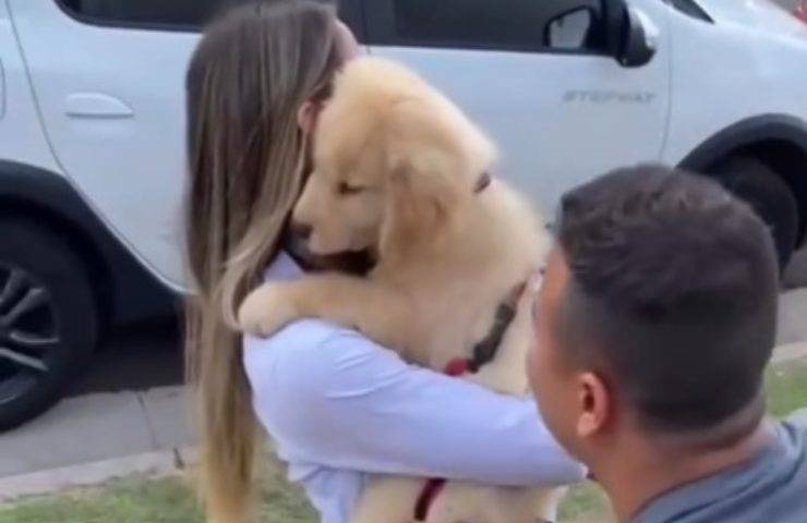 Uno sguardo fugace al pavimento dove qualcosa ha attirato l’attenzione della ragazza, inizia così il video, diventato ormai virale sul web, in cui un innamorato fidanzato regala un cucciolo alla sua compagna. Un cucciolo di Golden Retriever davvero irresistibile con tanto di fiocco rosso legato al collo, una sorpresa inaspettata che ha emozionato la giovane fidanzata, forse troppo!