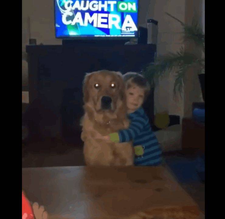Il cucciolo di Golden Retriever reagisce in modo dolce ed emozionante: si posiziona dietro il suo padroncino e ricambia l’abbraccio del bambino, stringendo le sue zampe attorno al piccolo umano.