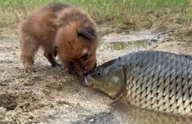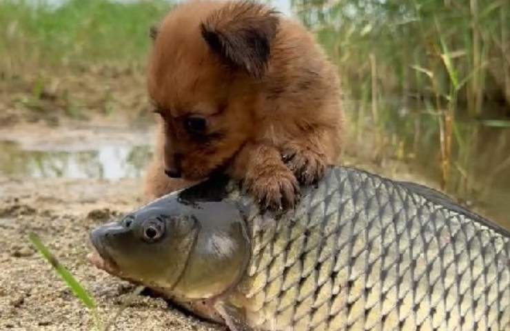 Cucciolo di cane incontra e diventa amico di una piccola carpa: tante coccole e bacini