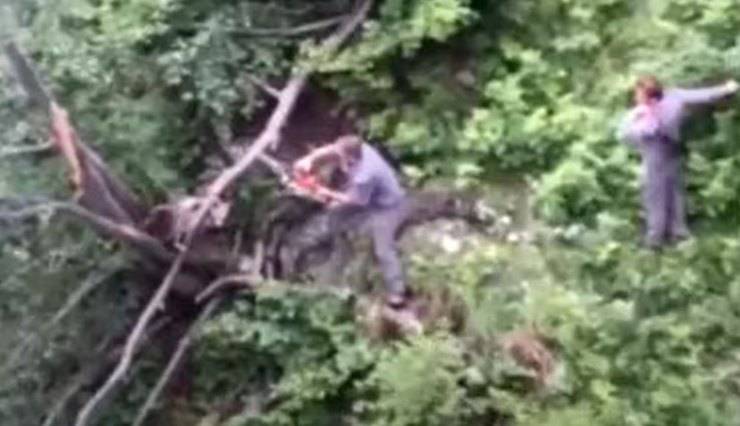 L’albero è il vero impedimento del cucciolo d’orso: provano a salvarlo cercando ai abbatterne una parte