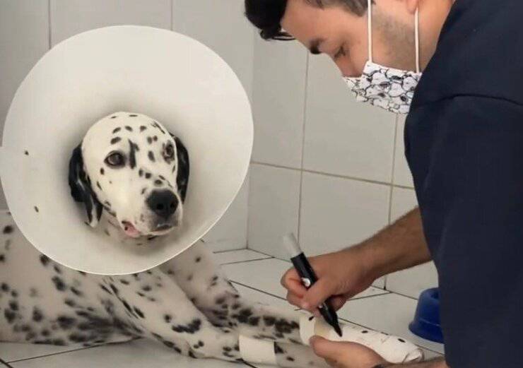 Il veterinario per rendere felice il dalmata disegna delle macchie sulla sua zampa ingessata