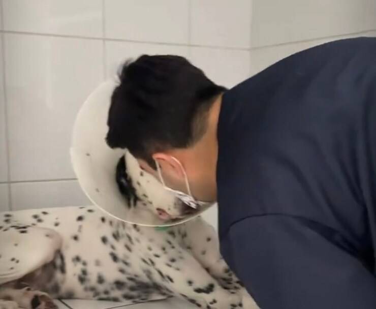 Finita la sua opera, sotto lo sguardo attento e curioso del cucciolo, si avvicina per lasciargli un tenero bacino, come a rassicurarlo che adesso andrà tutto per il meglio. Il dalmata rincuorato e rasserenato dalla calma e amore dimostrati dal ragazzo, scodinzola felice.