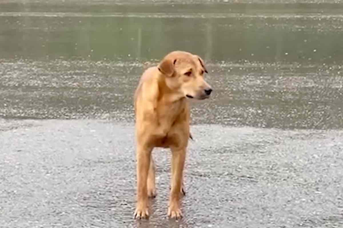Questo triste Fido è disperso sotto la pioggia: dopo essere rimasto a lungo in attesa che tornassero il finale si rivela “da brividi”.