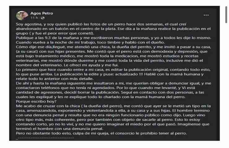 Tutto ha inizio due settimane fa in un gruppo Facebook chiamato “cani e gatti smarriti ritrovati alla Plata”, nel gruppo viene pubblicata una foto di un cane da una donna, Agostina, la quale credeva che l’animale fosse stato abbandonato su un balcone nel centro della città. Il cane aveva un aspetto stanco e sembrava non stare bene. Dunque dopo averci riflettuto la donna ha postato la foto sul gruppo. All’inizio tutti hanno creduto alla storia di Agostino e la donna è stata esortato a denunciare il fatto. In serata Agostina decide di presentarsi alla porta del proprietario del cane dopo aver suonato il campanello, ad accoglierla c’era una ragazza, la proprietaria del cucciolo, la quale ha cercato di rassicurarla invitandola dentro casa con le sue figlie presenti.