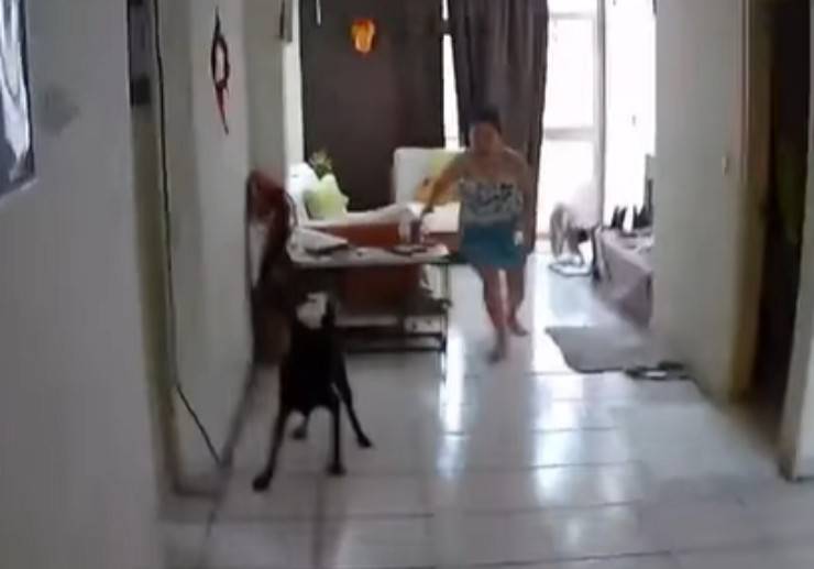 Spavento e paura per la donna ed il cane durante una potente scossa di terremoto. Lei ha subito protetto il cucciolo!