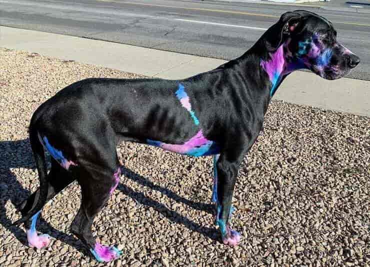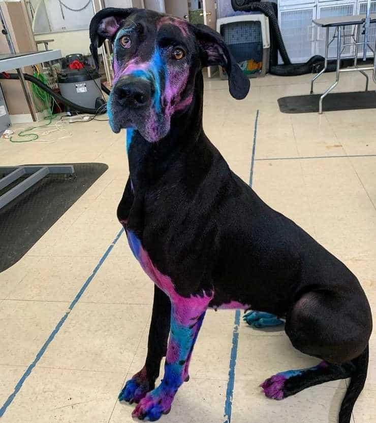 Una tolettatrice ha deciso di tingere il proprio cane con dei colori a base vegetale per renderlo più amichevole data la sua enorme stazza e ha rivelato che moltissime persone vedendolo le hanno chiesto se il cane fosse di una nuova razza derivata da un allevamento selettivo alla quale lei avrebbe risposto si è un Galaxy Dane.