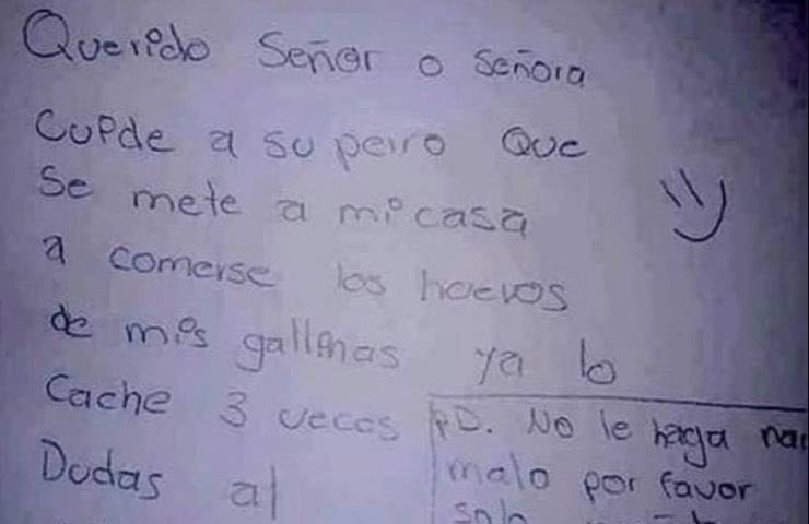 “Cari signore e signora” recita il biglietto: “tenete d’occhio il vostro cane che entra in casa mia per mangiare le uova delle mie galline“. I riceventi dell’inattesa visita avrebbero deciso di “denunciare” il fatto all’autorità familiare del fido dal momento che non era la prima volta che si verificava un simile episodio. Secondo quanto specificato sul biglietto pare questa fosse già la terza volta che il cane facesse irruzione nel loro appartamento.
