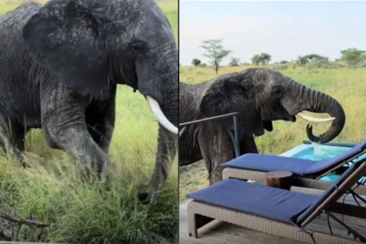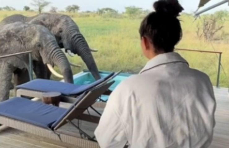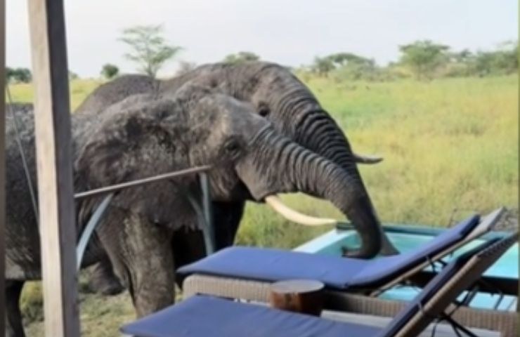 Una vista alquanto inaspettata, che tuttavia i due hanno accolto piacevolmente e senza timore, poiché sanno che in quel luogo meraviglioso si vive a stretto contatto con la fauna locale. In effetti siamo noi umani gli ospiti nelle terre di questi giganteschi esemplari, che non sembrano essere infastiditi dalla nostra presenza ma che comunque non rinunciano alle loro attività e cercano sempre di soddisfare le loro esigenze, come appunto quella di bere acqua (sebbene si tratta di quella di una piscina).