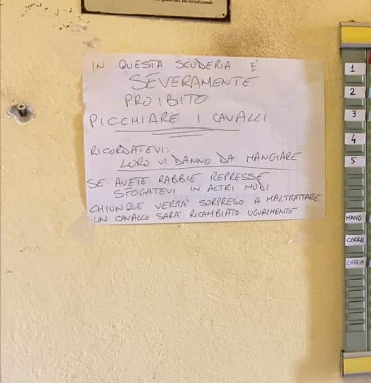 Il post delle guardie zoofile continua : ” Durante il sopralluogo, le Guardie Zoofile N.O.G.R.A. hanno notato i cartelli affissi dall’allenatore nella selleria della scuderia, da dove si evincono le “raccomandazioni” fatte ai dipendenti, a riguardo del rispetto dei cavalli”.