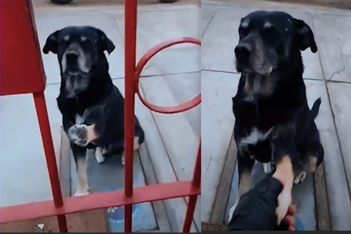 Le immagini diffuse dai media locali mostrano proprio un cane dal manto nero seduto davanti al cancello di una clinica veterinaria. Il cucciolo attende fiducioso l’arrivo degli umani. Non appena un veterinario si avvicina al cancello, il cane gli tende la zampa come se volesse salutarlo.