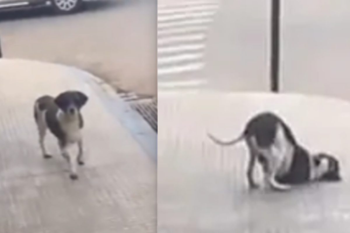 Conquistano i cuori degli utenti del web le immagini di un cagnolino che finge di essere malato per ricevere il cibo dai passanti.