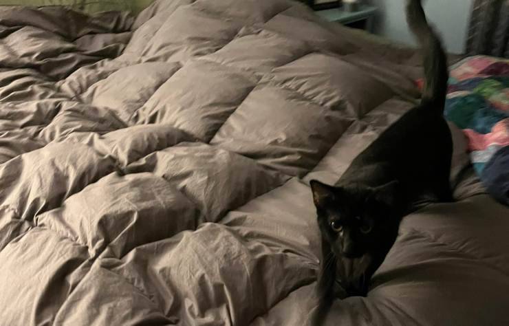 Poco dopo l’arrivo della pelosetta, il suo umano ha iniziato una relazione con una donna allergica ai gatti. Per tale motivo, alla gattina nera è stato proibito di dormire nel letto con il suo padrone, come aveva sempre fatto dal giorno della sua adozione.