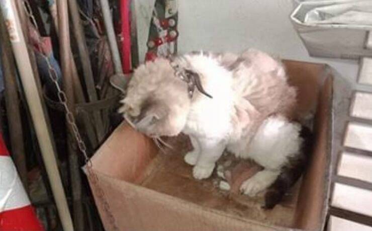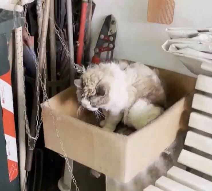 “Il povero animale, di circa dieci anni, era adagiato su uno straccio sporco dentro un vecchio cartone logoro” continua per descrivere le sue condizioni “posto in bilico sopra una cuccia in mezzo ad altri oggetti“. Aggiunge anche di come appena trovata, la gatta risultasse disorientata, non rispondeva agli stimoli, e aveva il pelo pieno di nodi e tutto arruffato.