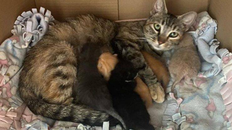 La gatta che partorisce nel magazzino viene chiamata Marigold: ora i suoi gattini sono tutti al sicuro