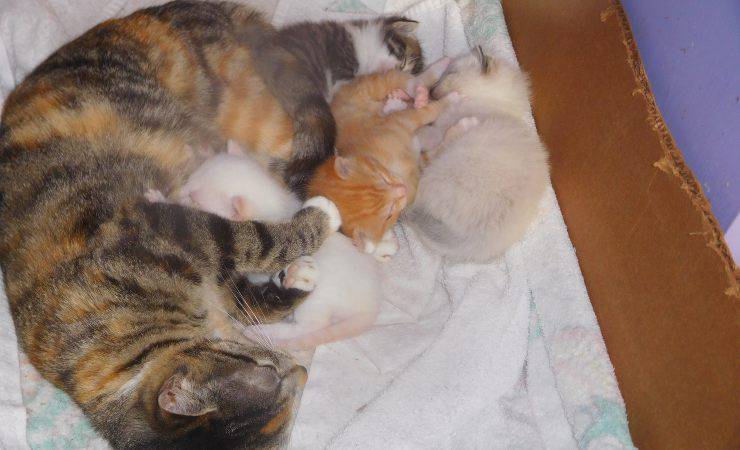 Aveva dato alla luce cinque, meravigliosi, gattini. Certo, il posto non poteva rimanere quello, un po’ sporco e non adatto per crescere dei cuccioli. L’uomo ha pensato di portarli via con sé, compresa la gatta, che ha capito subito l’intenzione dell’amico essere umano e si è lasciata trasportare via insieme ai gattini.
